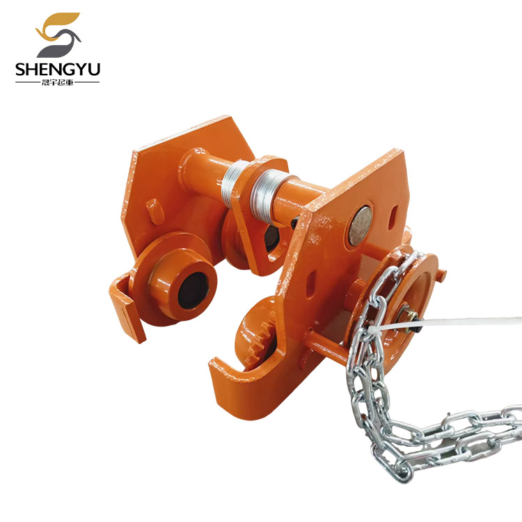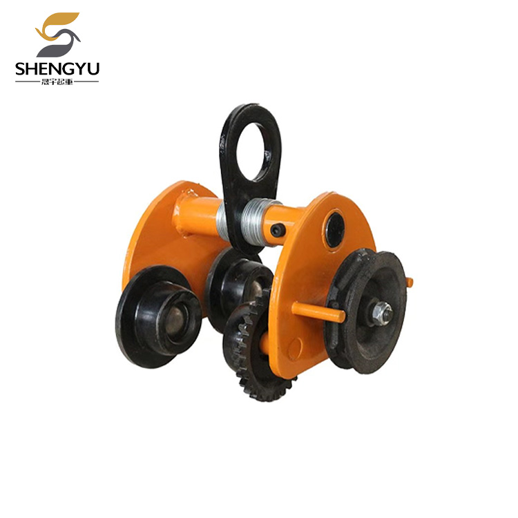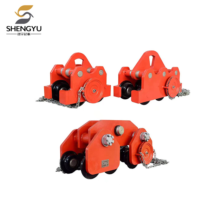 Acionados por uma corrente manual, eles viajam ao longo da borda inferior do trilho da viga I. Quando equipado com talha de corrente, serve como ponto de suspensão móvel para equipamentos de elevação. Desta forma, o carrinho com engrenagens pode não apenas levantar objetos pesados verticalmente, mas também permitir o movimento de objetos pesados para a esquerda e para a direita.